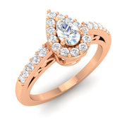 A stunning pear shaped stone is the center of attraction in this beautiful halo.
